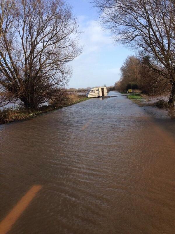 An abandoned caravan on the A361 during the floods of 2013-14.